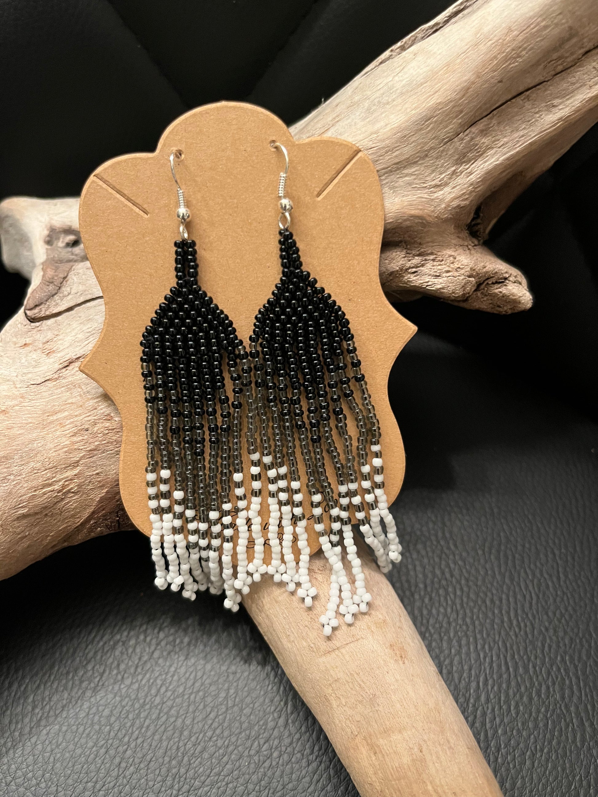 Inspired by the quiet strength of nature and the rhythmic waves of Lake Superior, these earrings bring elegance and movement to your everyday style. These handmade earrings feature a stunning ombré gradient—black at the top fading into crisp white at the bottom—crafted from delicate seed beads that form long, flowing fringe strands.